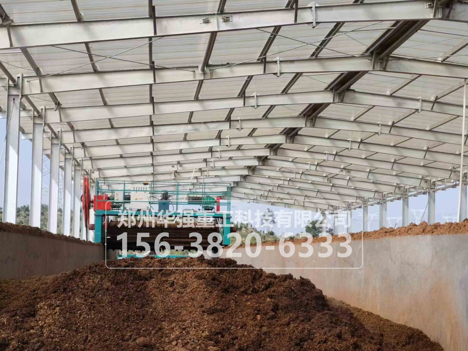 水分調(diào)整合適的物料按照高度和寬度分層鋪成條垛狀,條垛平行排列在露天或室內(nèi)的平坦的堆肥場上,采用專業(yè)翻堆機(jī)騎跨在料堆上連續(xù)翻堆作業(yè)。料堆截面形狀為三角形或梯形:寬1.5-2.5m,高0.8-1.4m,長度50-150m(視堆肥場地的形狀尺寸來確定)。